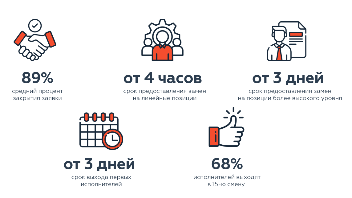 - Быстрое закрытие вакансий. Предоставляем персонал от 3-х дней с момента получения заявки.