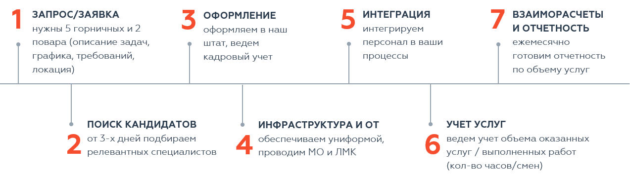 - Гибкость под ваши задачи. Выведем столько специалистов, сколько нужно – уменьшим или увеличим численность персонала с зависимости от сезона и нагрузки.
